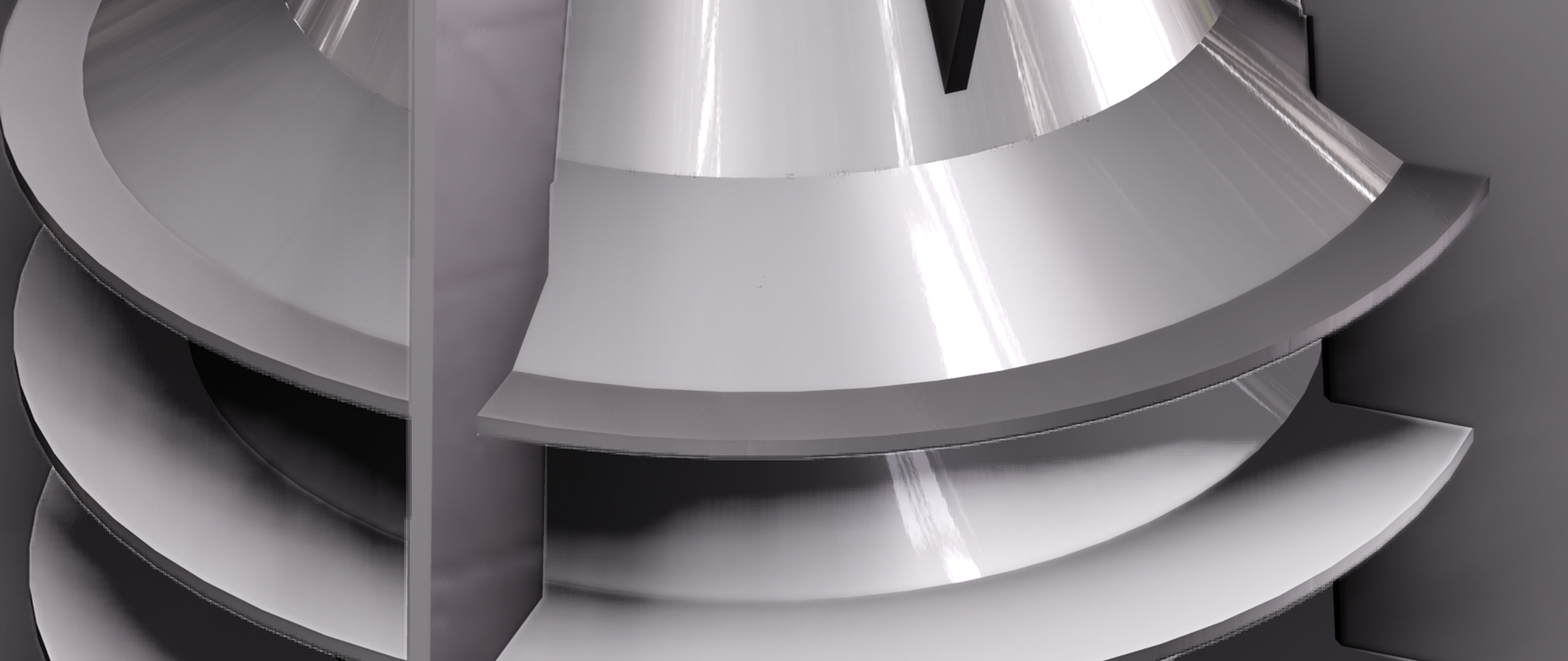 Questo distributore, comunemente conosciuto come Schoepentoeter, è caratterizzato da una struttura a lamelle che lo rende adatto a separatori bifasici e trifasici in presenza di elevati momenti in ingresso, elevate portate di gas e elevate pressioni. L’orientamento e la forma delle lamelle favorisce la distribuzione uniforme del gas nel separatore ed effettua la separazione della maggior parte delle fasi liquide da quella gassosa.